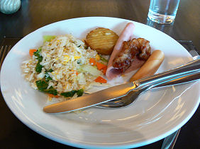 受付の女の子にフロントで渡された朝食券を渡し、先ずは座席を確保します。続いてどこに何があるのかさっぱり分からないので、食べ物の見聞です。