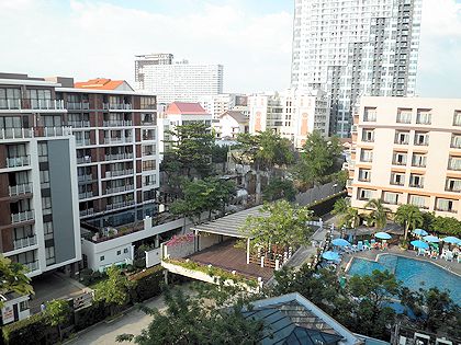 バルコニーからの景色は、正面下にプールが見え、あとは建物ばっかり。ただ隣の建物までは距離があるので、感覚的には開放的で広々としています。